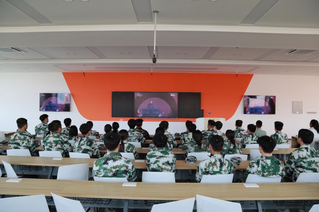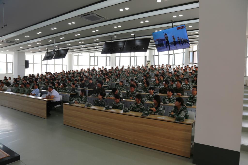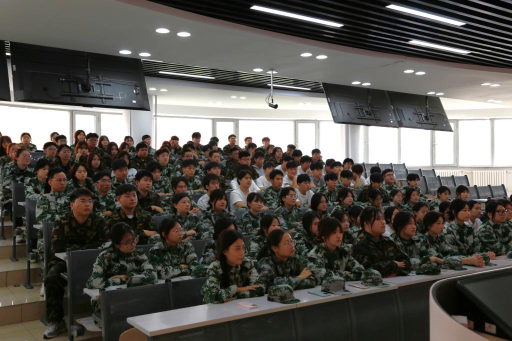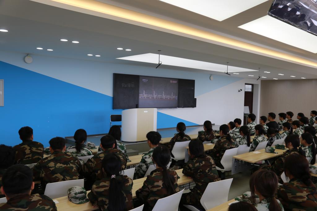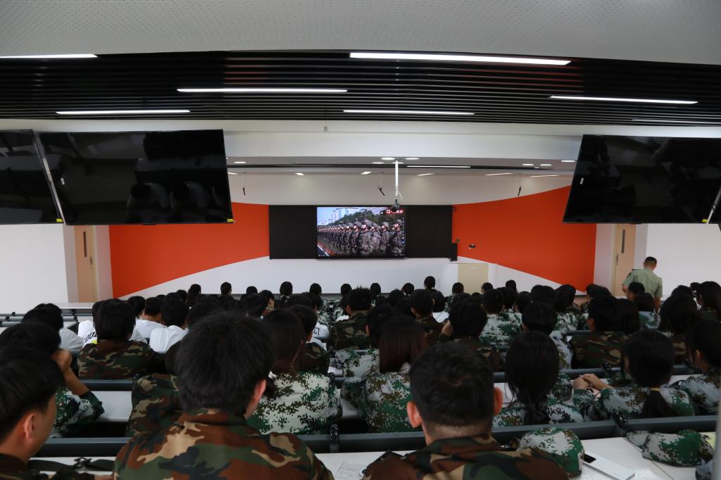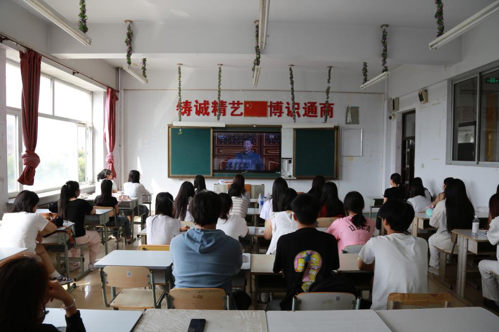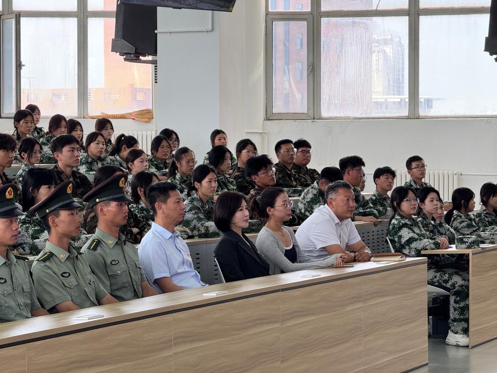 在阶梯教室,经理梁春江、副经理郭宁、校团委组织部王茜、员工科科长齐新宇、员工科副科长张弢及2025级新生辅导员带领全体新生集中观看。