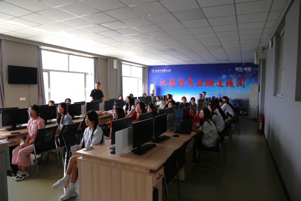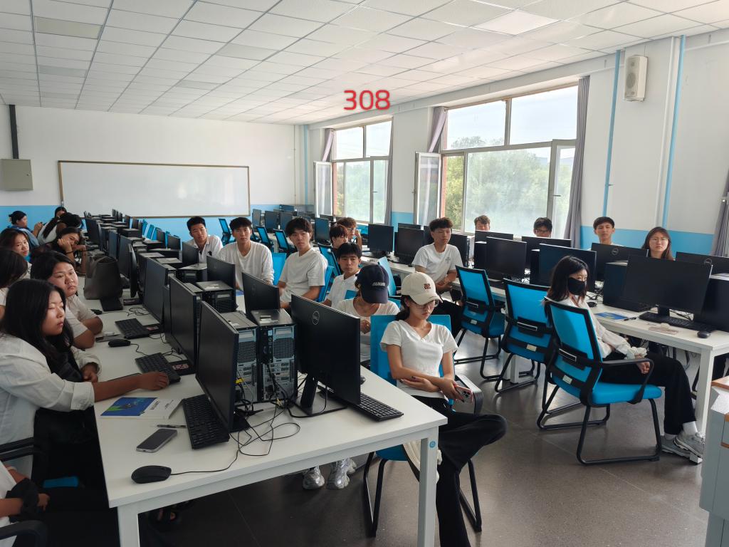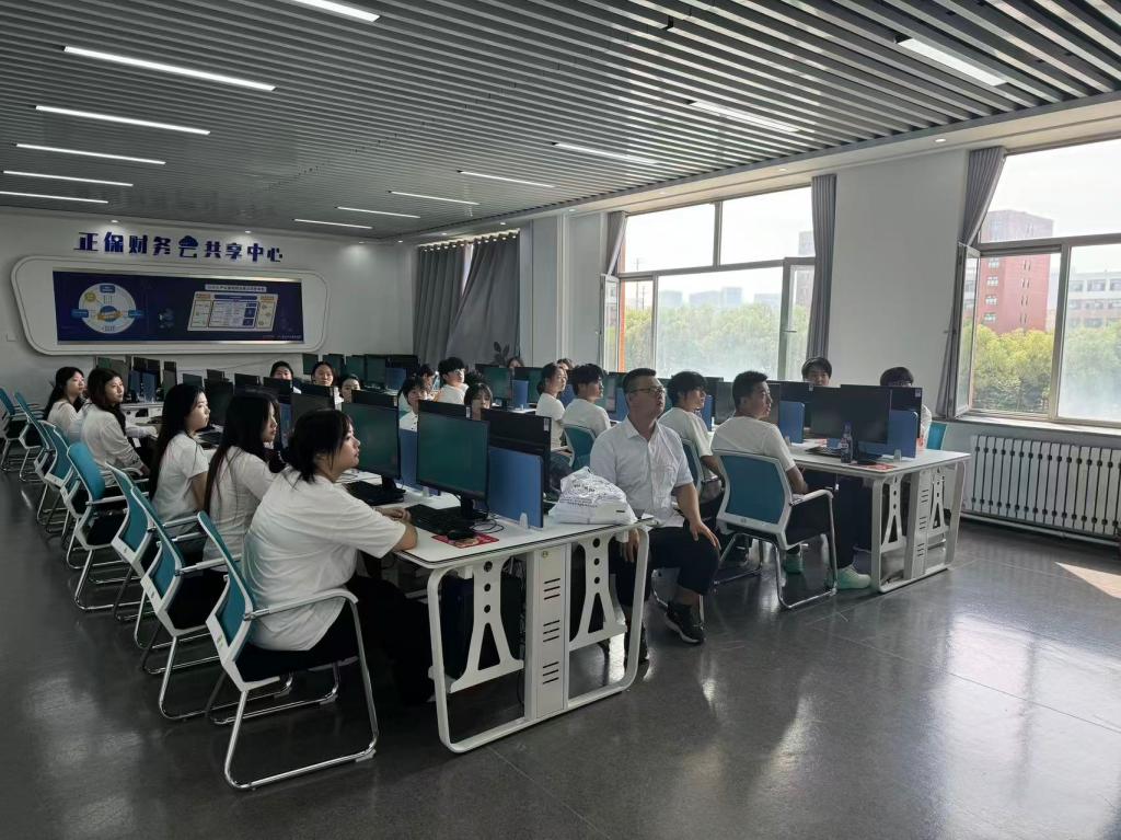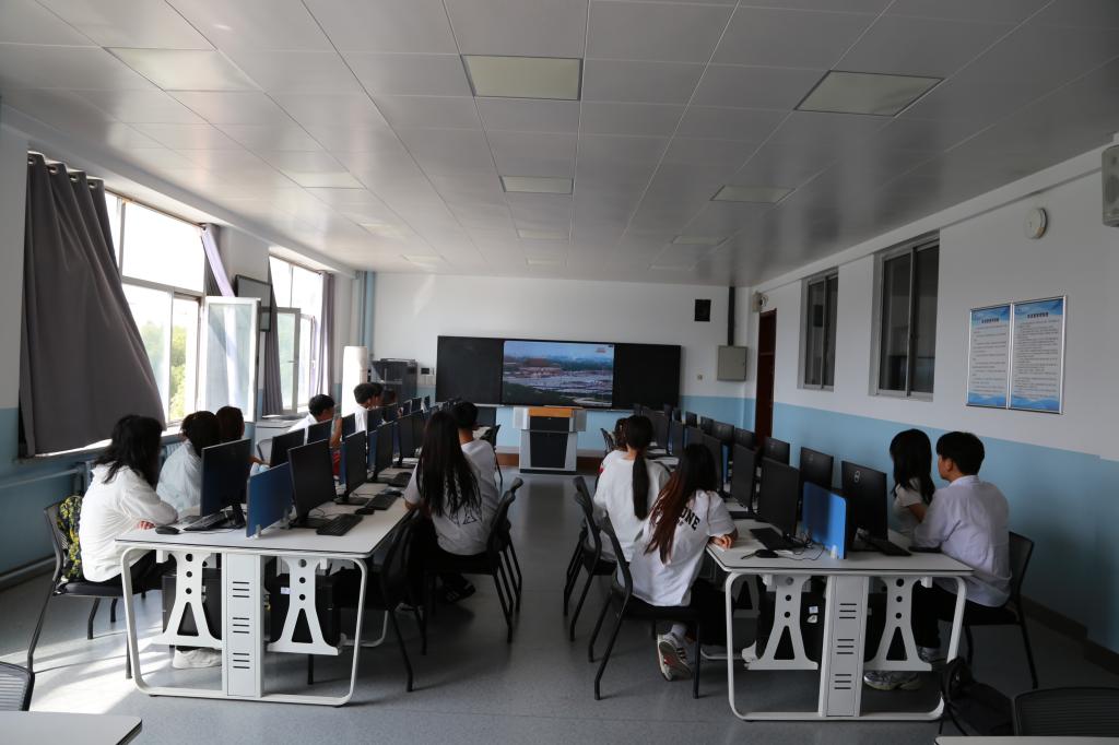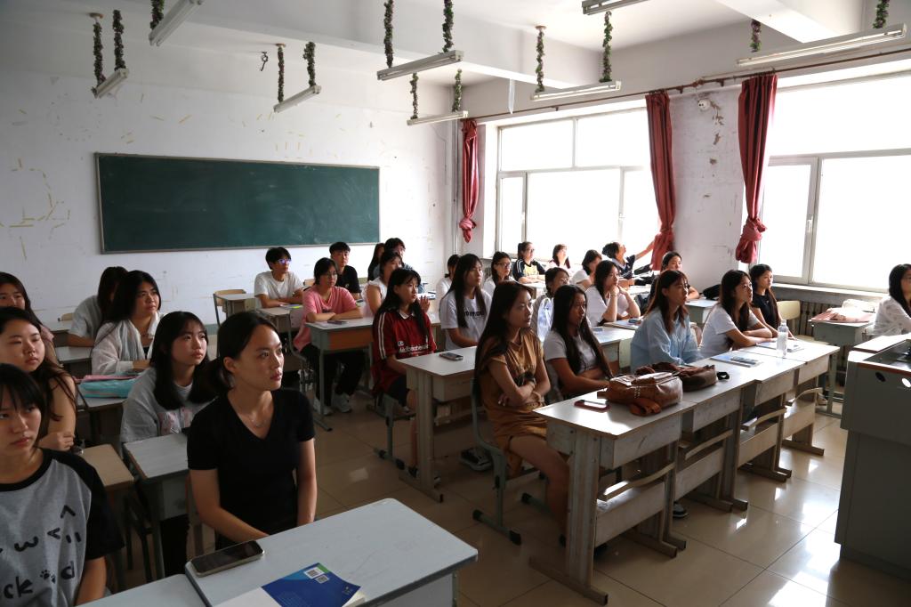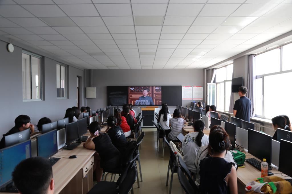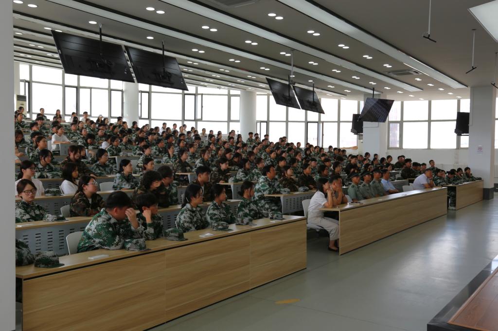 在阶梯教室,经理梁春江、副经理郭宁、校团委组织部王茜、员工科科长齐新宇、员工科副科长张弢及2025级新生辅导员带领全体新生集中观看。