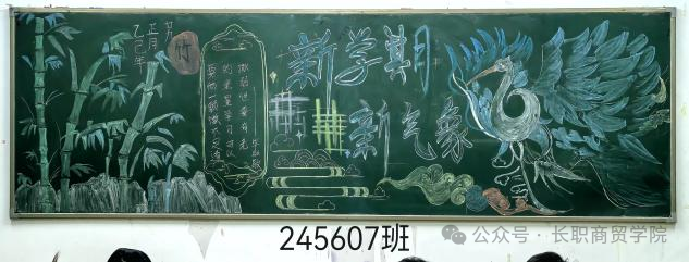 ✨评委寄语:该板报融合了中式元素和创意,展现了一幅有趣且富有想象力的画面。板报以青绿色调为主,象征着自然的色彩和生命力。青鸾、各种树木、山峦等自然景观,体现了当代青年学子对传统文化的传承和创新和新学期大展宏图的愿景。
