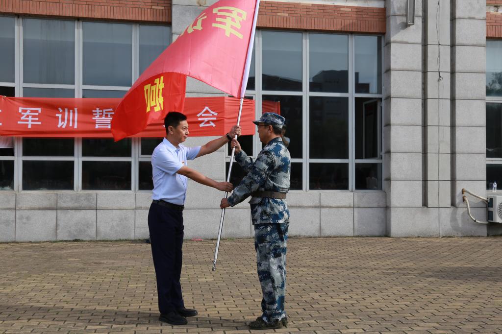 誓言余音未落,庄严的授旗仪式正式开始。经理梁春江向军训营队授予营旗。营长赵春雷同志郑重接旗。一面面鲜红的连旗,是荣誉的象征,更是责任与使命的传递。它将在训练场上飘扬,指引着各连队奋勇争先,争创佳绩。